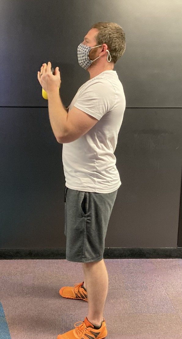 - Grip the weight firmly with both hands and raise it up so it’s under you chin but not resting on the top of your chest, then pull your shoulder blades down and back to ‘set’ the shoulders in place, this will help you maintain a flat back and prevent rounding forward.