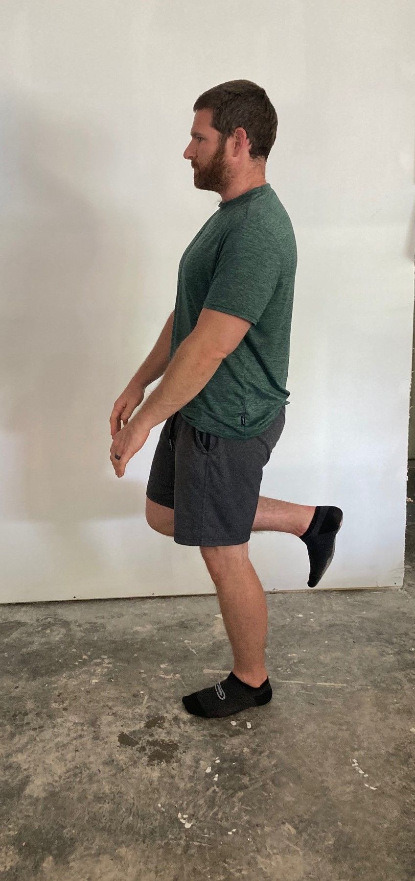 - Stand on one leg, with a slight bend of the knee you’re on.