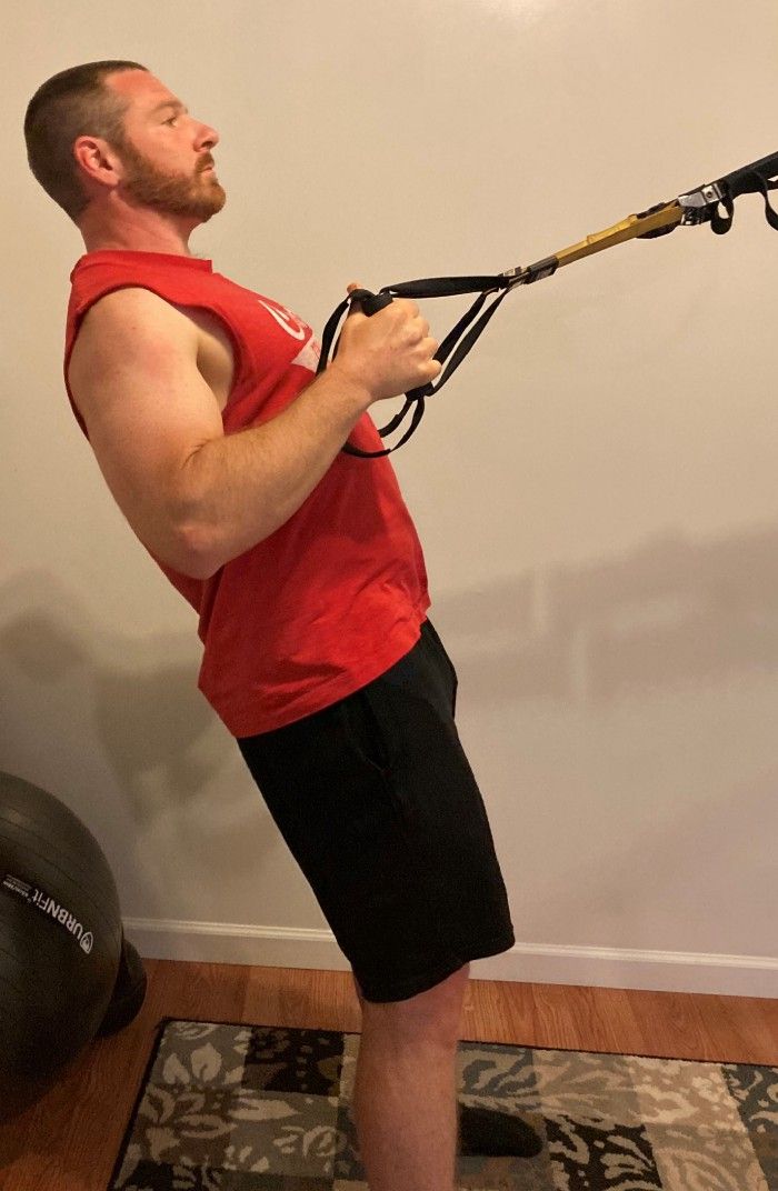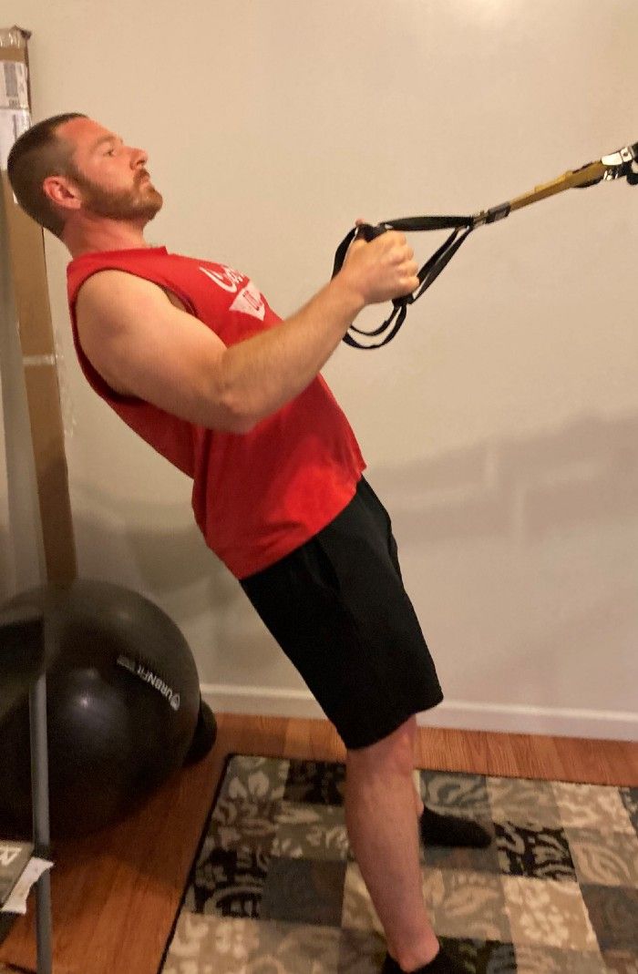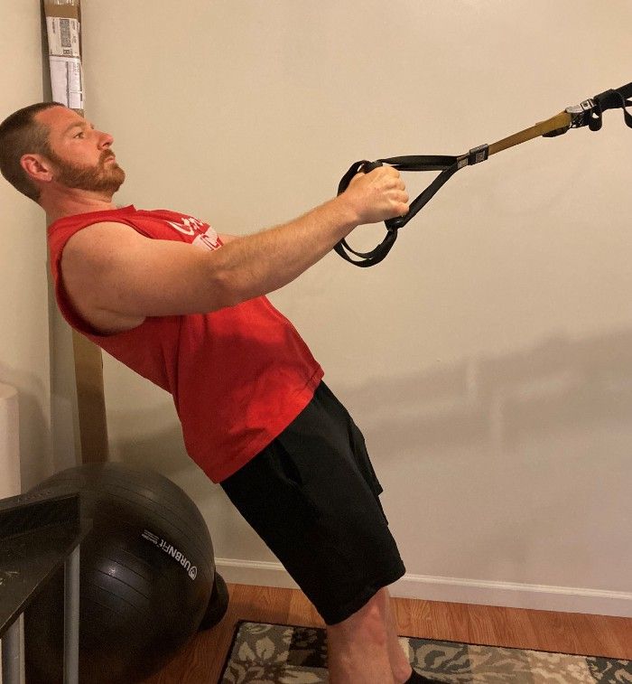 Adjusting the resistance on this is very easy. Simply move your feet closer to the anchor point of your TRX to make it harder, or step back to make it easier.
