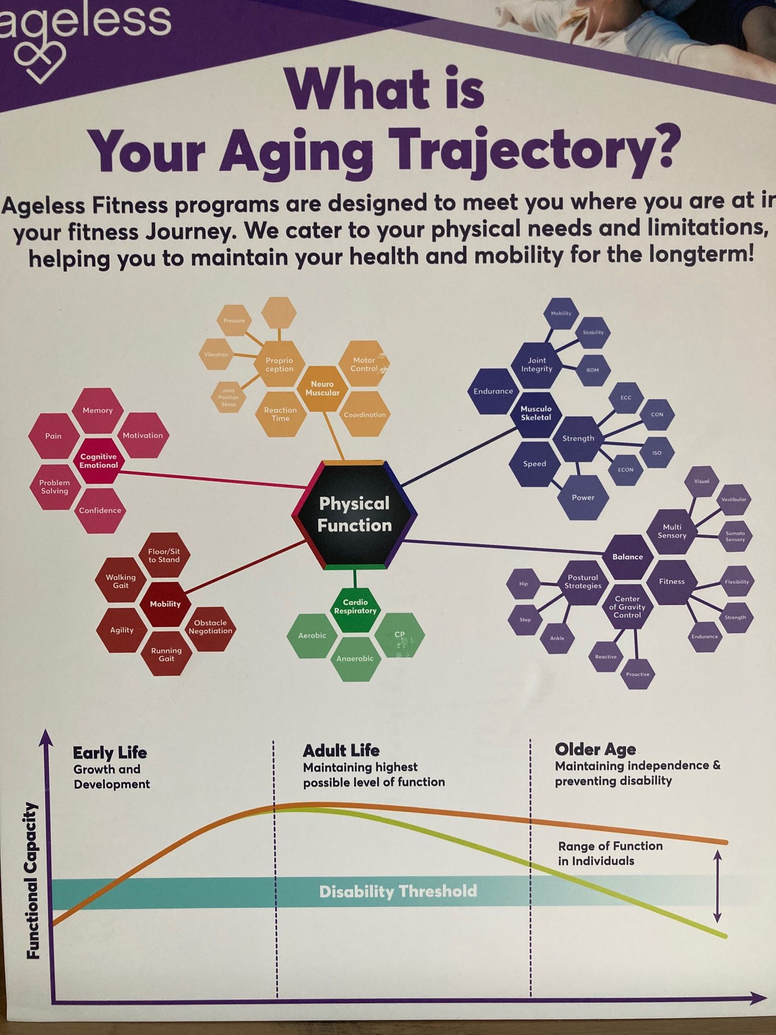 As you can see from the above photo, physical function is comprised of a myriad of factors, all of which are trained when you work with a Functional Aging Specialist at Ageless Fitness.
